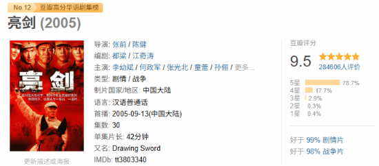 现在在豆瓣平台上,有超28万用户参与评分,该剧获得了9.5分的高评价。这部剧改编自都梁的同名小说《亮剑》,描绘了革命军人李云龙(由李幼斌饰演)在抗日战争、解放战争、抗美援朝等不同历史阶段的经历,其军人的本质始终未曾改变。