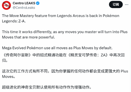 根据知名《宝可梦》爆料站@Centro Leaks的最新消息,《宝可梦传说:阿尔宙斯》里的“精通招式”系统,也就是包含刚猛与迅疾招式的机制,将会在《宝可梦传说:Z-A》中重新出现。