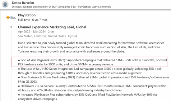 这些数据是由前PlayStation总监Denise Barcellos分享的。他在讲述自身工作经历时表示,自己曾参与《战神:诸神黄昏》的项目开发,还透露该作品在当时对PS5硬件销量的增长起到了显著的推动作用。