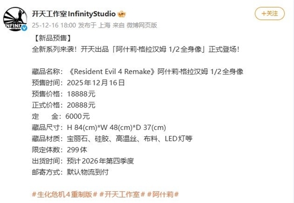 开天工作室推出的《生化危机4:重制版》艾什莉·格雷厄姆1:2比例限定雕像目前已启动预售,该雕像定价为20888元,预售期间价格为18888元。