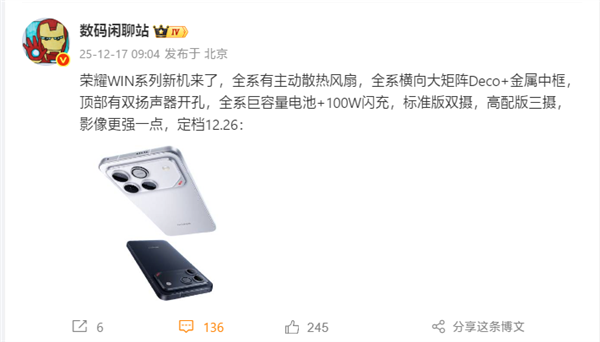 12月17日消息,荣耀WIN系列今日正式官宣发布时间,确定于12月26日正式推出。