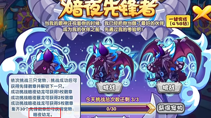 想要获取暗夜幼龙,各位可以先前往VIP广场,在地图里选择【光明圣殿】,进入光明圣殿后再选择进入魔龙空间。在魔龙空间中,玩家需要通过挑战来获取徽章,当徽章累计到30枚时,就能得到这只备受期待的宠物;战斗过程中,玩家要依据敌人的属性与技能,灵活运用自身技能。借助龙之舞提升速度等级,力求在战斗中率先出手,通过沙尘狂风等技能牵制敌人,为后续的攻击创造有利条件。