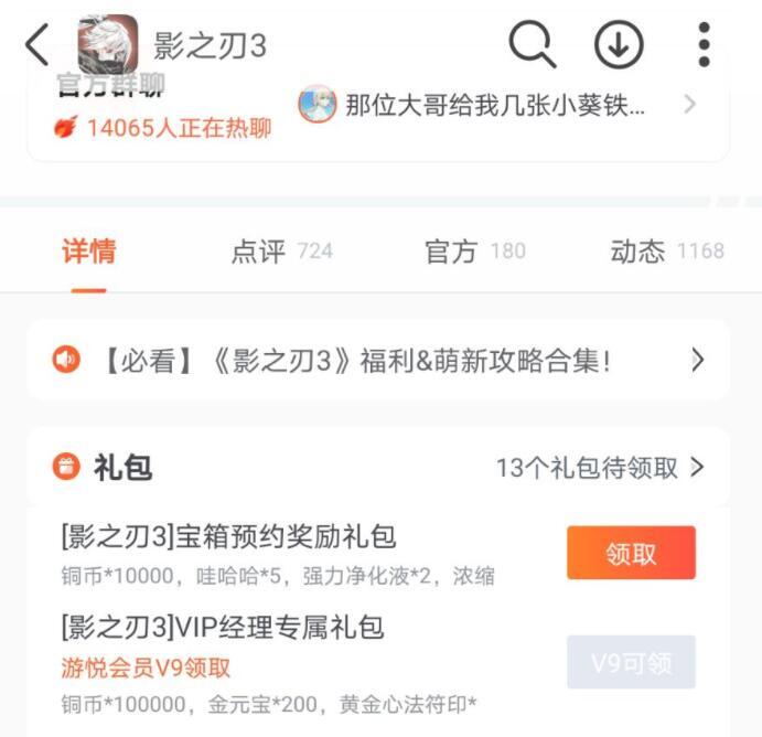 另外,《影之刃3》有不少游戏礼包可以领取。在不同渠道服的APP里找到这款游戏,点击进入后查看游戏介绍,就能看到礼包码提示,直接选择领取并复制就行。而且,在九游平台上也有很多礼包可供挑选:打开九游找到《影之刃3》,能看到十多个礼包;要是成为九游VIP并加入工会,还能找到专属的VIP礼包和工会礼包。各位玩家快行动起来试试吧。