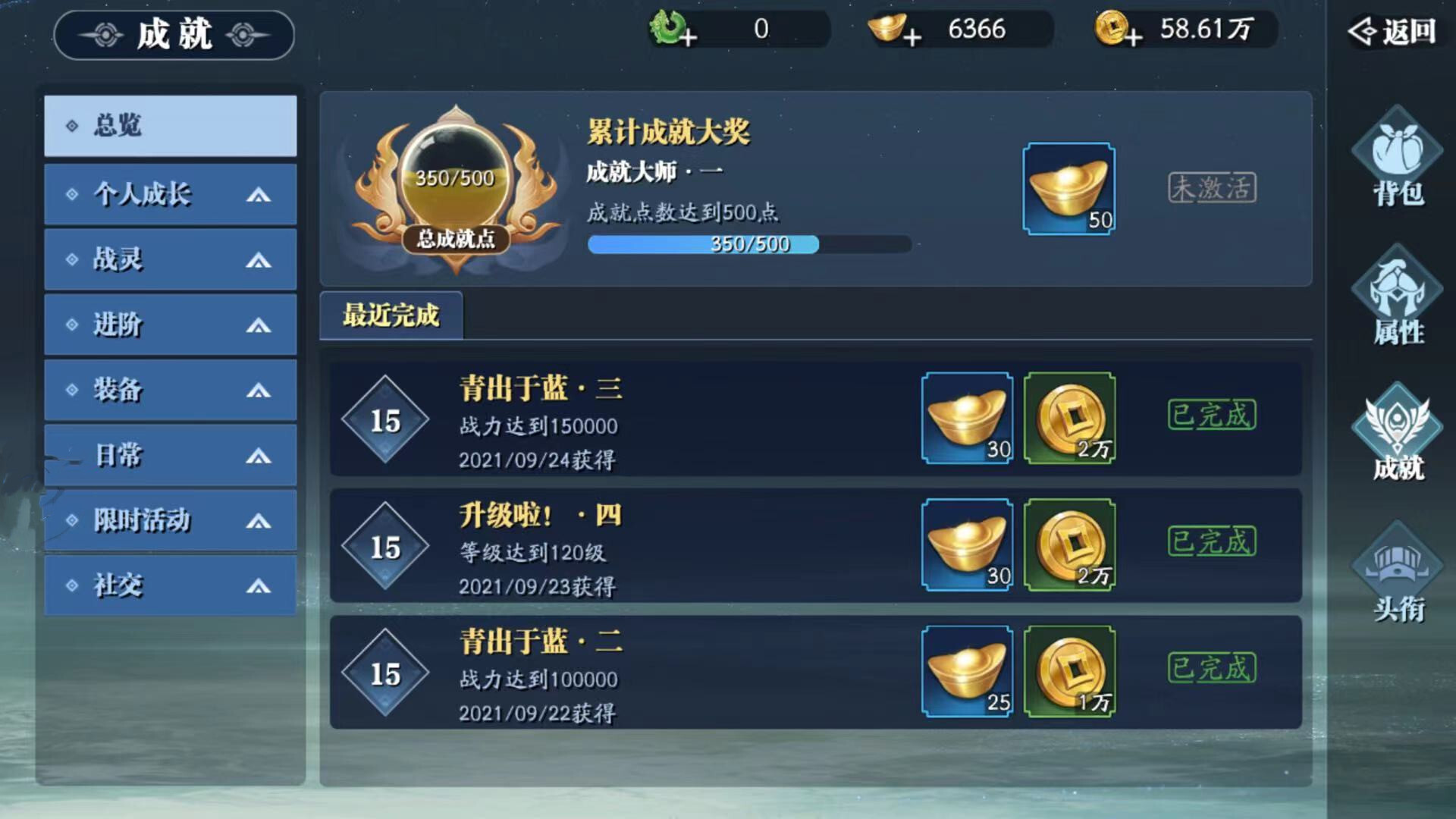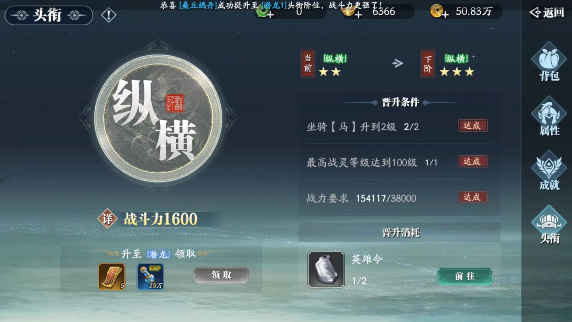 在主页面的头衔界面里,玩家能看到背包、属性、成就和头衔这些内容。成就部分包含了完成各类挑战任务所获取的不同成就奖励,而头衔则需要玩家持续达成对应的晋升要求才能获得。