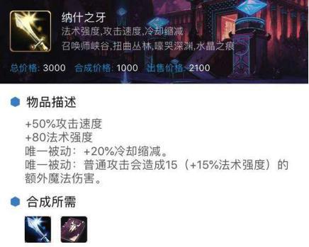 出装方面小编建议选择纳什之牙,这件装备的属性加成效果很出色,不过像小法师这类英雄采用这种出装思路的玩家应该不算多。而像天使、提莫这类依赖普攻进行输出的英雄,通常会更常使用纳什之牙这件装备。