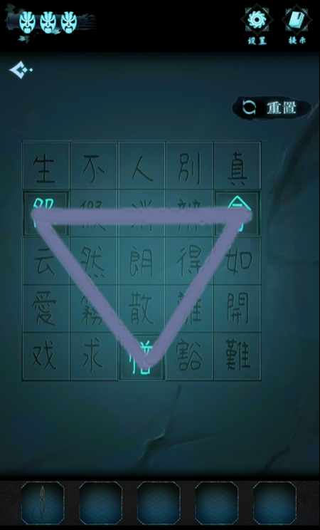 在墓地寻得木盒后,留意盒上的九个字并获取道具【青灯】。接着依据线索前往黑衣人所在场景,将桃木剑插入石壁上恶鬼面具的口中以触发机关。随后使用小青灯,分三次分别点亮“怨憎会”“爱别离”“求不得”三组字,同时观察每组三个字构成的三角形形态。完成这些步骤后,返回墓地即可打开木盒,得到线索【人生如戏、真假难辨、云消雾散、豁然开朗】。之后再次回到石壁前,按顺序点亮这十六个字,并用剪刀剪断藤蔓,便能获得芭蕉扇。