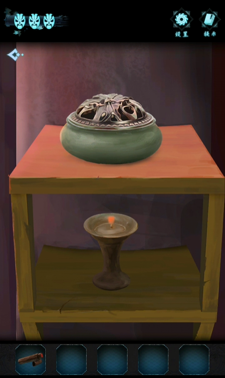 进入房间后,先点燃蜡烛,通过观察棺材上的姓氏,发现线索指向墓地。于是前往墓地,在白帆上找到“南王夏徐”四个字,并记住它们的位置。返回房间后,找到对应位置的四个符号,按从左到右的顺序为【3214】,用这组字符即可打开桌上的密码锁。打开桌子后,从中获取线索和一把钥匙,同时在桌面上拿起道具【竹篓】。接着用钥匙打开角落的木箱子,拼好里面的脸谱,就能得到道具【银元宝】。之后再次前往奈何桥场景,对着桥头前的蓝色花丛使用竹篓,就能捕获蝴蝶。
