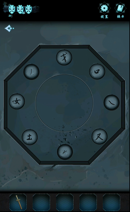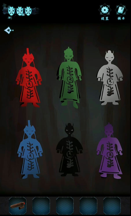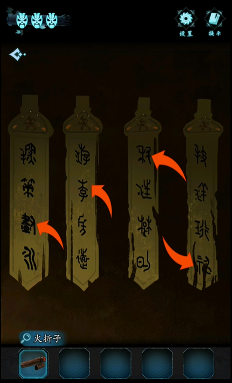 在黑衣人场景里点击麻布,能得到符号方向信息【左右左左右右右左】,接着依照这个顺序调整左侧的石灯,就能获取桃木剑和机关按钮。要留意“人生如戏”这四个字,之后点击房子的侧墙面,将圆形按钮放入,再按照“人生如戏”的笔画顺序依次点击,就能得到剪刀和线索。