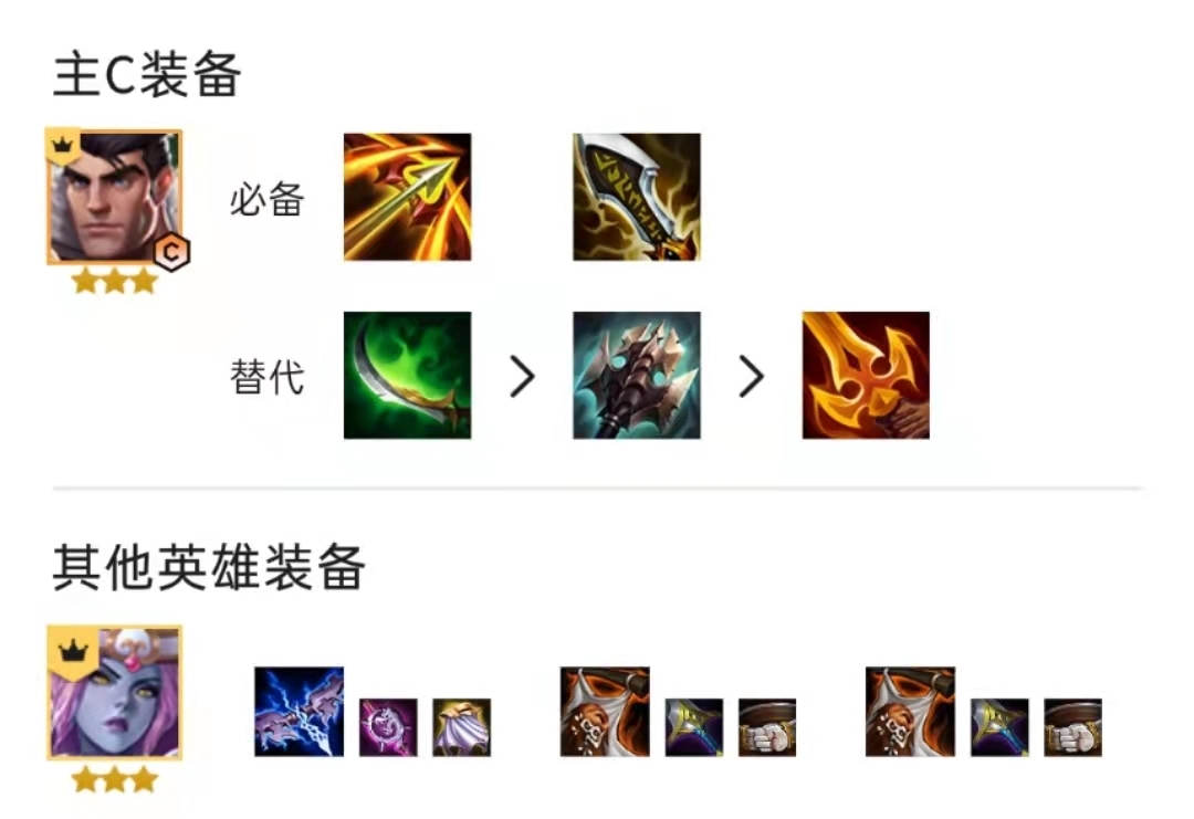 这套阵容对装备需求不高,玩家不用担心拿不到合适的装备。蜘蛛的装备适配性很强,不过搭配三神器辅助装效果最佳。杰斯建议优先分配AD输出装,三星后开启大招能快速击杀敌方前排,4-2阶段爆出的特效装也优先给他。剩下的装备可以灵活分配,多余的肉装给御界守腰子,多余的AP输出装则给剑魔。
