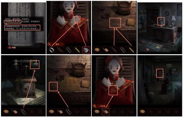 第三步,找到柜子上的万花筒并拿起它。通过万花筒能看到好几条不同的线索,每条线索都指向不同的门。进入对应的房间后,就能获取到各异的道具、饰品以及小方块。接下来,你要把得到的小方块放到柜子上的拼图机关处,依照拼图给出的提示操作,就能打开柜子拿到绣花鞋,再将绣花鞋放置在童男童女的纸人身上。另外,这个房间里还藏着一个十分隐蔽的线索——暗格。你得仔细寻找并打开暗格,里面同样会有相关线索。最后,记得用剪刀剪开红绳,同时留意观察木偶的情况。