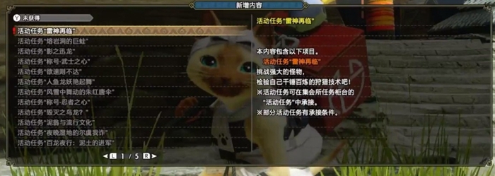首先还是老规矩,先把机器连上网,再把《怪物猎人崛起》游戏更新到最新版本。之后进入游戏,就能看到新增内容的提示,接着前往炎火村信使的位置与其互动,选择新增内容选项,就能找到活动任务“雷神再临”了。