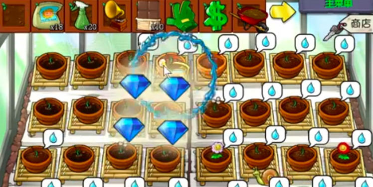 接下来,种子上方会出现一个水滴形状的图案,这时玩家就能选择黄金水壶为这些种子浇水灌溉。每次成功浇水后,玩家都能获得一定数量的金币,用这些金币可以购买新的种子或者更高级的塔防装备。当然,除了浇水,玩家还能给种子使用杀虫剂、施肥或播放音乐,不过这得看种子的需求——如果种子有具体需要,都会在上方的白色框里直接显示出来。