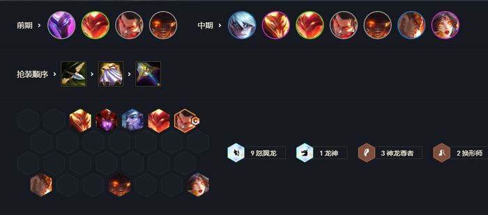 上面这个就是万豪体系的站位了,这里面是常规的9怒翼龙体系,搭配亚索凑出三神龙打输出,万豪既能吃到自身的怒翼龙加成,又有神龙羁绊提升额外的法术强度和生命值,让坦度有所增加。