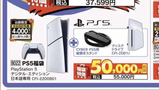 本次促销活动的核心产品是2025年11月才在日本推出的新款PS5数字版(型号:CFI-2200B01)。这款机型被称作“日本限定版”,其官方建议零售价为55,000日元(已包含税费)。
