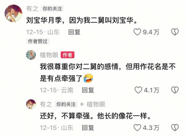 直到网友康先生(网名“有之”)留下一句“刘宝华月季,因为我二舅叫刘宝华”,还打趣二舅长得像花一般,这条评论立刻点燃了评论区,热度也随之节节攀升。