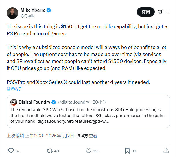 在社交媒体平台上,暴雪前总裁Mike Ybarra对Digital Foundry关于GPD Win 5的评测做出了回应。他称自己认可这款掌机具备便携性优势,不过以它当前的定价来看,倒不如直接入手一台PS5 Pro更为划算。