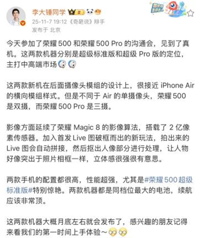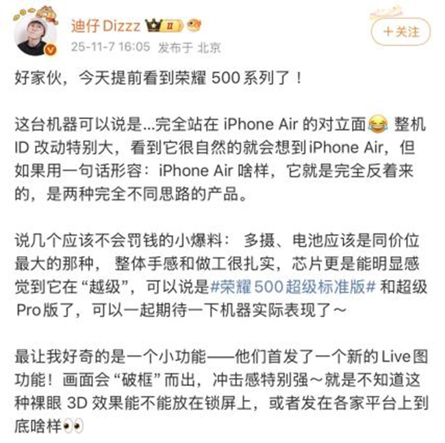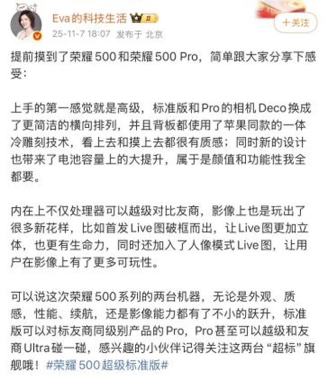 根据目前曝光的信息,荣耀500系列“双超”的产品实力已清晰地展现在我们面前,无论是设计语言、工艺水准,还是核心配置、续航表现,每一项升级都精准满足了用户的深层需求。不过,这可能还不是它的全部实力。相信荣耀的新品发布会定会为我们带来更多惊喜,让我们共同拭目以待!