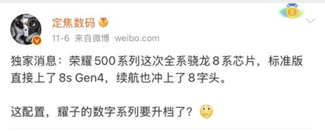 自“双超来了”悬念海报发布后,荣耀500系列就一直受到行业和用户的广泛关注。从已曝光的信息可知,这款新机不仅继承了荣耀数字系列在影像和设计上的长处,还在多个产品力维度完成了跨越式提升,力求为用户带来名副其实的越级体验。
