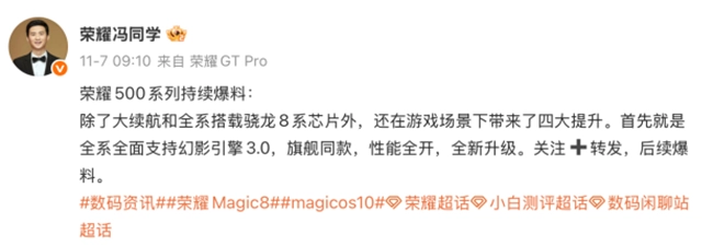 续航表现上也实现了显著飞跃,当行业内大部分机型的电池容量仍维持在7000mAh上下时,荣耀500系列的电池容量将超越8000mAh,结合荣耀完善的功耗调控技术,能有效减轻用户的续航顾虑,成为同价位段续航能力的新基准。