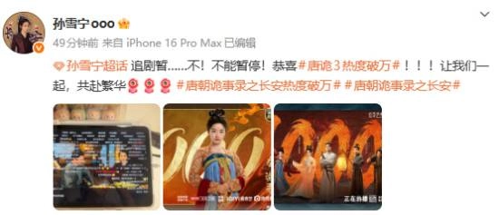 @孙雪宁ooo :“追剧暂停?不!根本停不下来!恭喜《唐朝诡事录3》热度破万!!!快和我一起,共赴这场繁华盛宴[比心心][比心心]”