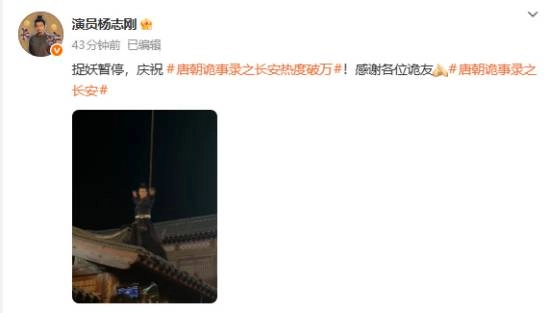 @演员杨志刚 :“捉妖的事儿先放一放,咱们庆祝《唐朝诡事录之长安》热度破万!特别感谢每一位诡友的支持!”