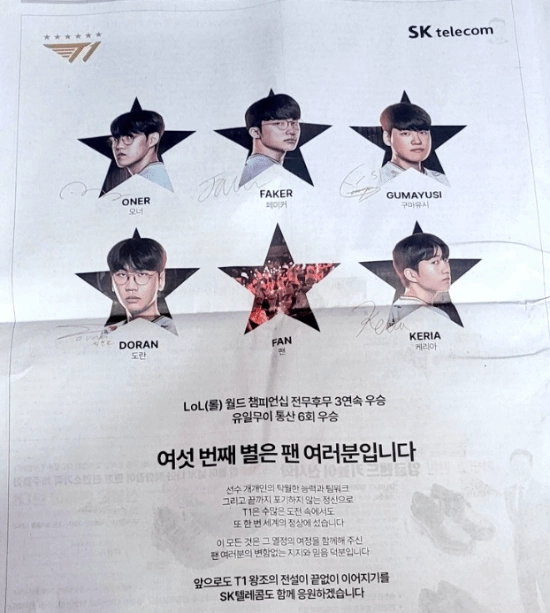根据韩国网友的分享,T1战队在夺得第六冠后,选手们登上了韩国报纸版面。每位选手的名字旁都配有一颗象征冠军的星星,而多出的那一颗星星,是属于所有粉丝的!