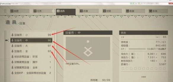 然后回到游戏界面查看你的道具栏,看看里面有多少个回复药水,不管是哪种回复药水都可以,我这里选择通过回复药水中来搜索内存,目前我的回复(中)数量是90个。