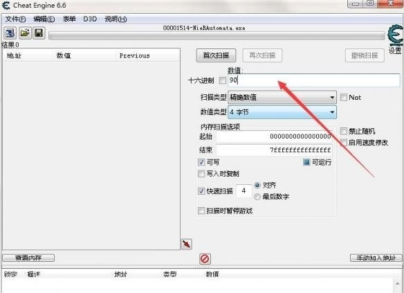 你可以这样修改:在CE的16进制输入框中填入“90”,接着点击“首次扫描”按钮,此时会出现像图片2展示的那样大量基址。