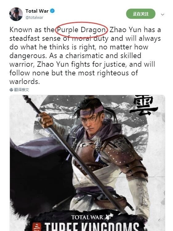 有意思的是,《三国:全面战争》的官方推特好像在拼音的理解上闹了点小乌龙,把赵子龙叫成了“紫龙(PurpleDragon)”。不过没过多久就把这段描述删掉了,瞧这官方,还挺会调皮的嘛!