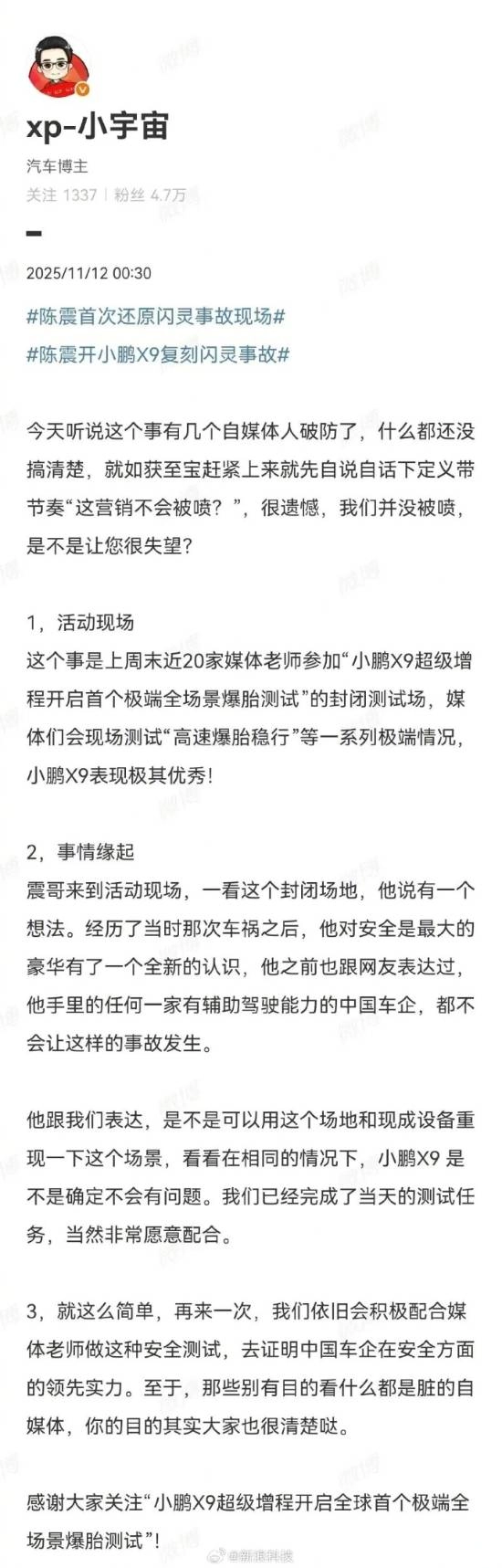 小鹏汽车员工@xp-小宇宙在微博发文解释了相关情况:上周末,有近20家媒体的老师参与了“小鹏X9超级增程开启首个极端全场景爆胎测试”的封闭测试场活动。陈震来到现场后提出一个想法,想利用现有场地和设备重现相关场景,验证小鹏X9在相同条件下是否确实不存在问题。由于当时已完成当天的测试任务,所以团队非常愿意配合。他还表示,未来若有类似需求,依旧会积极配合媒体老师开展这类安全测试,以此证明中国车企在安全领域的领先实力。