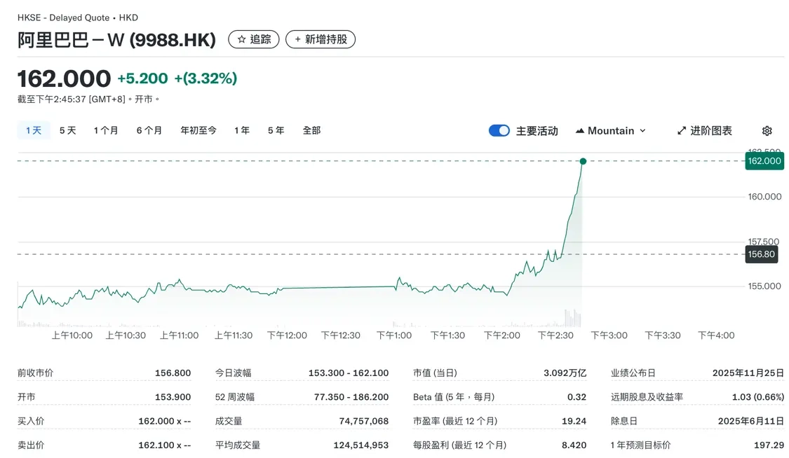 截至发稿时,阿里巴巴在港交所的股价上涨5.2港元,报收162港元,涨幅达3.32%。回顾过去52周,其股价最高曾达到186.2港元,最低则为77.35港元。
