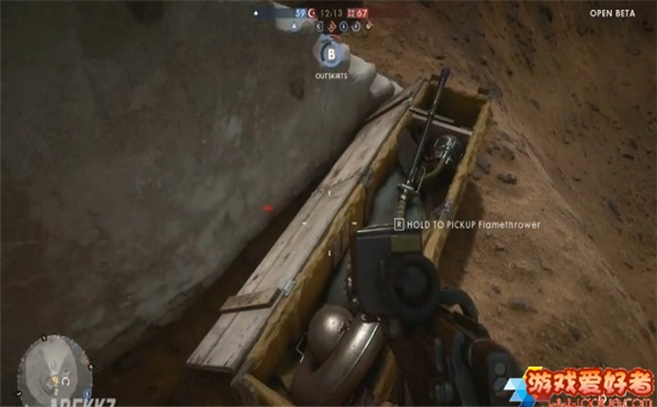 B点的角色是喷火兵,在B点复活后,你朝着那面破墙跑过去,接着跳进去,左边的那个武器箱就是目标。之后按下E键拾取,就能切换成喷火兵了。
