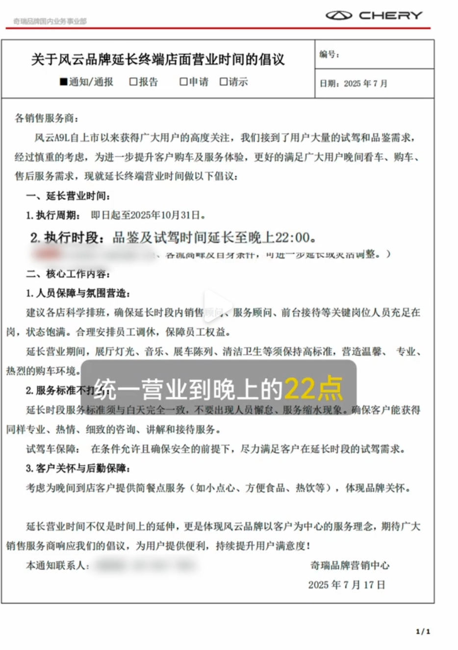 奇瑞在发布的通知中,鼓励旗下风云品牌的线下门店将营业时间延长4小时,直至晚间22点。通知同时明确要求,各门店需确保延长营业时段内销售顾问、服务顾问、前台接待等关键岗位人员充足到岗,并以饱满的精神状态开展工作;此外,延长时段的服务标准必须与白天正常营业时间完全一致,严禁出现人员工作懈怠、服务质量下滑的现象。