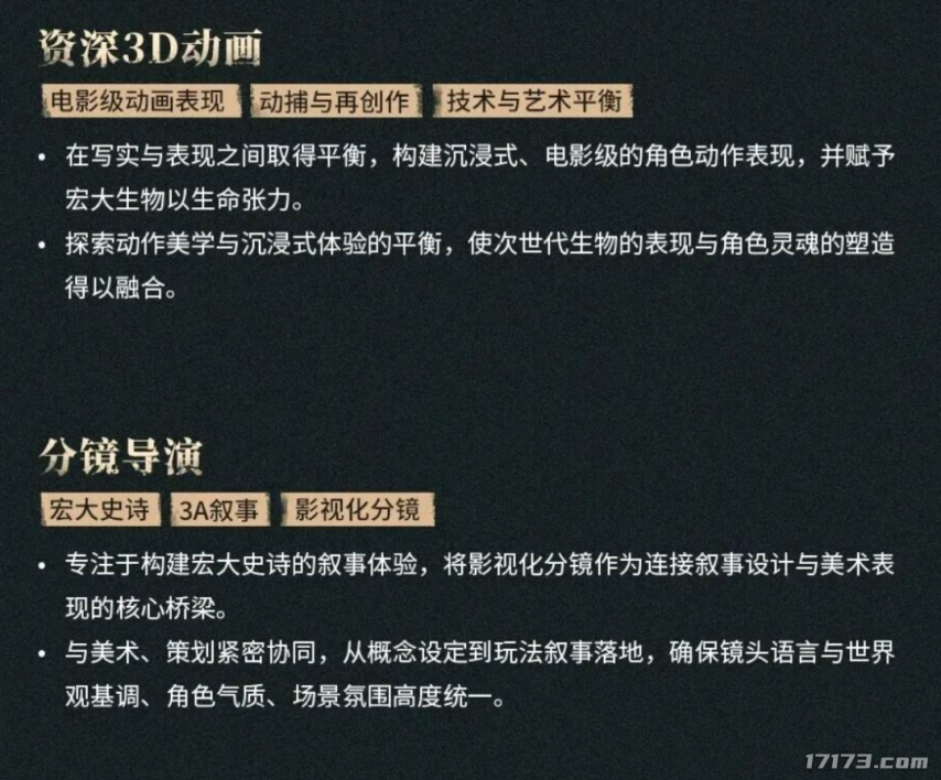 在美术与技术层面,该项目提出需“在写实风格与表现手法之间达成平衡”,而动画岗位则清晰要求打造“具有沉浸感、达到电影级水准的角色动作呈现,同时为宏大生物注入富有生命力的张力”。