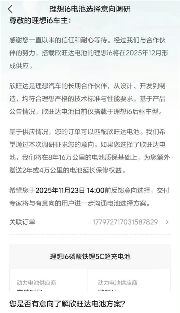 从日前曝光的《理想i6电池选择意向调研》可知,配备欣旺达电池的i6后驱版预计在12月实现供应。若用户选择欣旺达电池,理想汽车将在原有的8年16万公里电池质保服务之外,额外提供2年或4万公里的电池延长保修权益。
