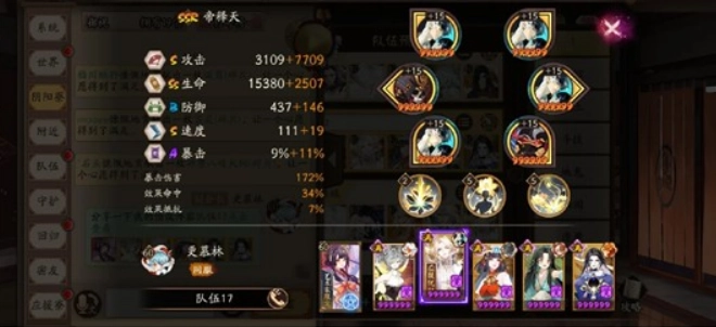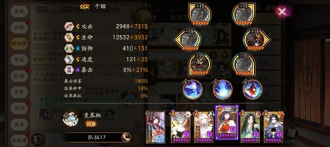 阵容配置如下:SSR阶式神八岐大蛇、SSR阶式神千姬、SP阶式神追月神、SSR阶式神缘结神、SSR阶式神帝释天,搭配阴阳师神乐,神乐携带的技能为疾风与炼狱。