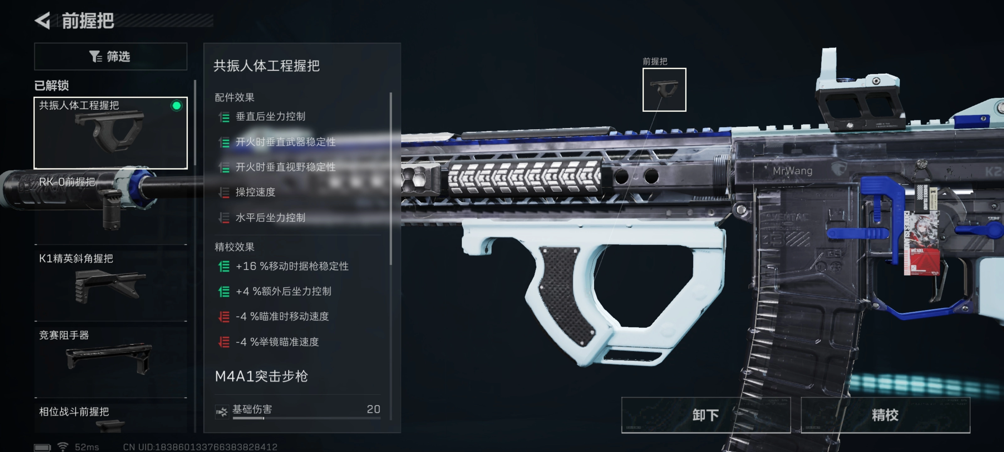 前握把选用共振人体工程学握把。枪口之所以不选择沙暴垂直补偿器,是因为这把枪的垂直后坐力并不突出,对新手来说,它可以算作入门级枪械之一。