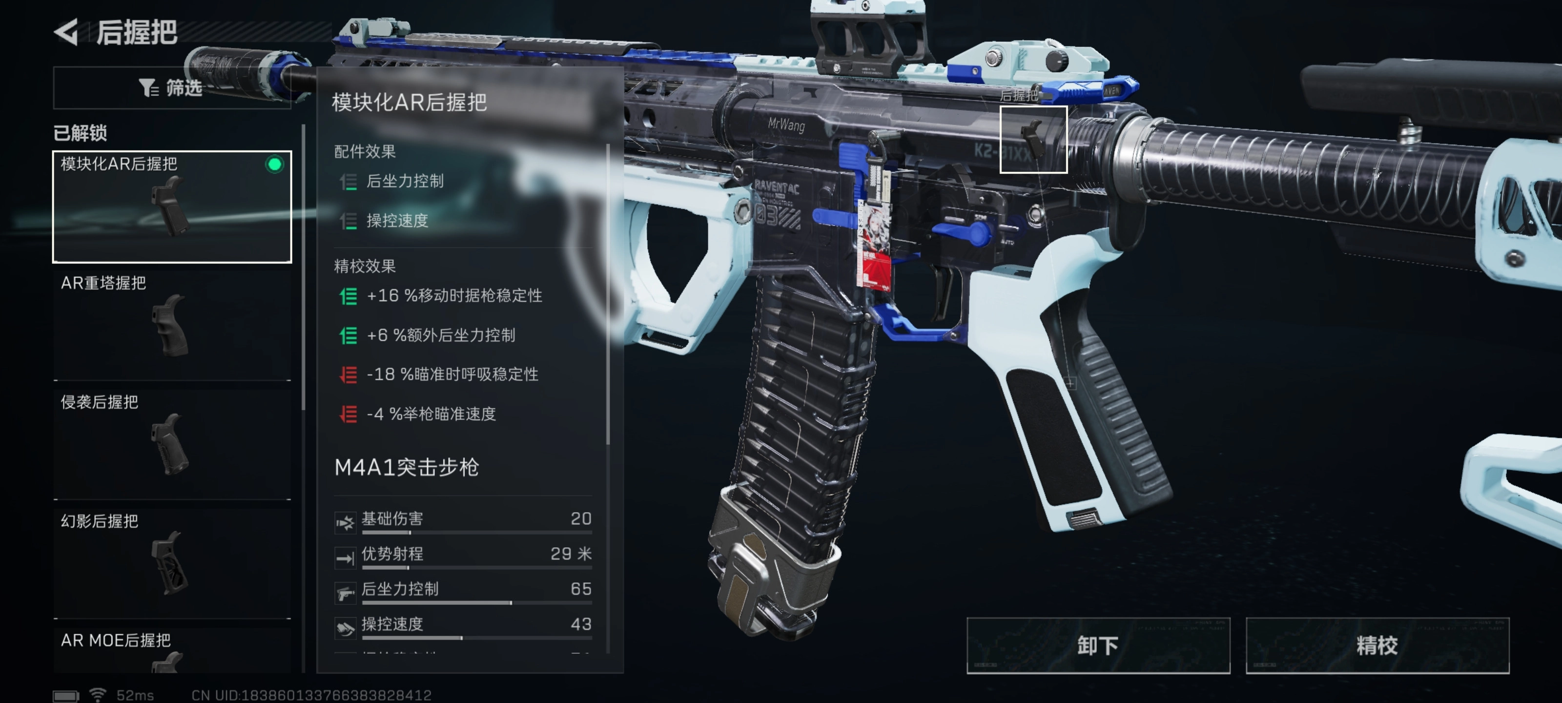 后握把仍采用模块化AR后握把搭配AR重型握把片的组合方案。该组合在大幅提升枪械后坐力控制能力与据枪稳定性的同时,还能将对操控速度的影响降至最低。