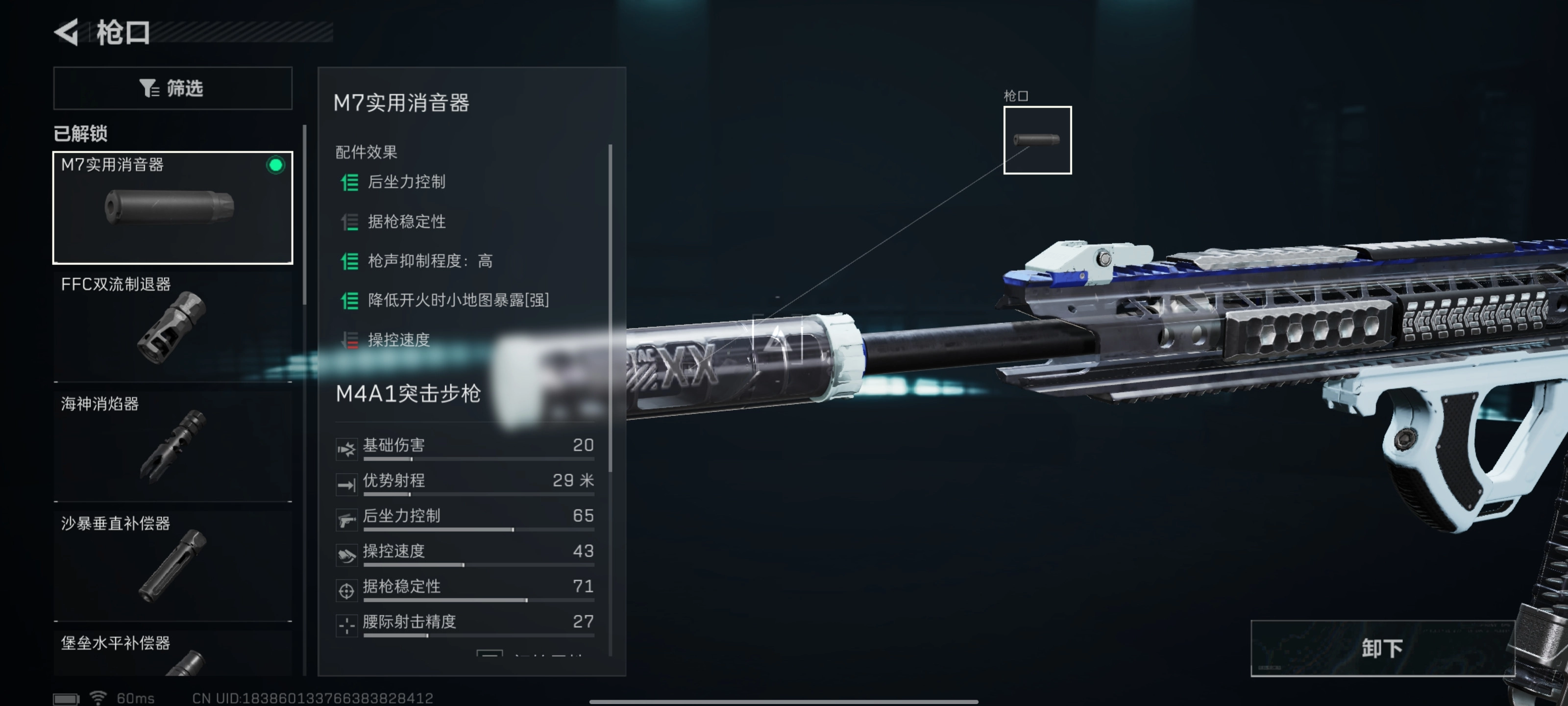 枪口选用M7实用消音器,这样既可以改善M4A1在后坐力控制方面的短板,又能以最低成本降低其操控速度。