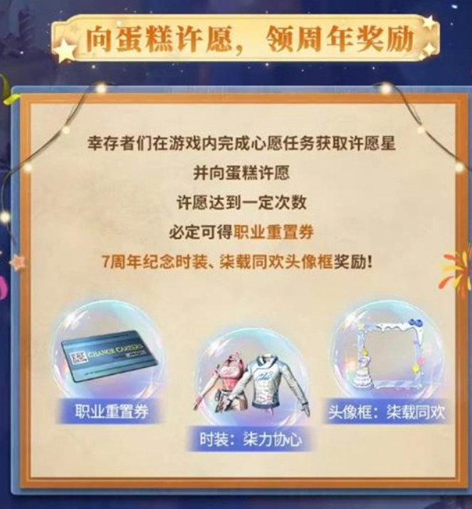 活动期间,幸存者完成心愿任务即可获取许愿星。当许愿次数累积到一定数量时,就能100%解锁职业重置券、7周年纪念时装、PS5等重磅周年福利!