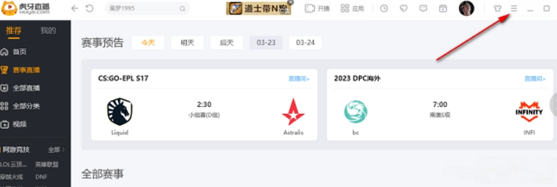 首先启动虎牙直播应用,接着点击界面右上角呈“三条横线”样式的菜单按钮。