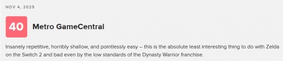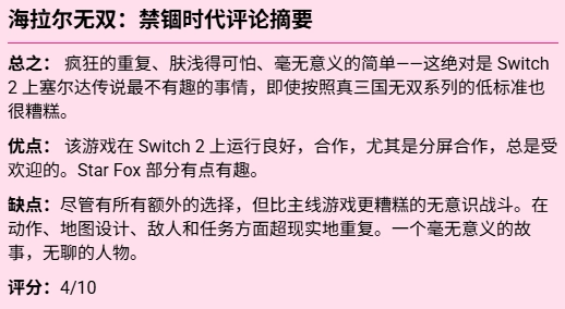 外媒Metro GameCentral是唯一给出差评的媒体,仅给出4分(满分10分)。评测指出,游戏玩法内容极度重复且肤浅,难度设计不合理,战斗系统相比正统作品有所倒退,地图、任务设计单一,故事和角色也缺乏吸引力。不过,评测也提到Switch2运行流畅,分屏合作模式和部分《星际火狐》式关卡设计略有新意。