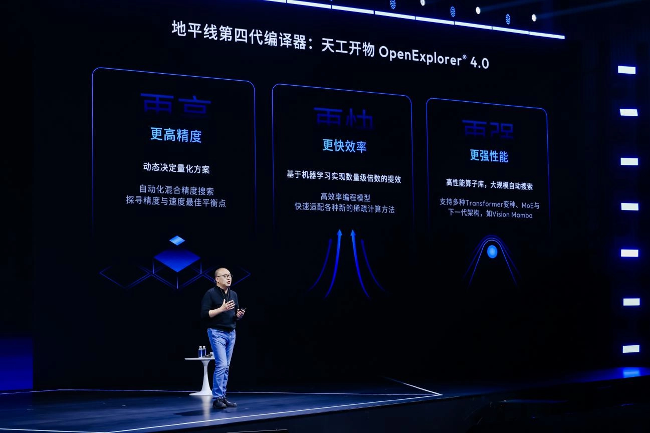 编译器持续进化,全面进入“AI驱动编译”时代。作为交响乐的指挥,地平线的编译器技术同样经历了三代迭代。本次发布的第四代编译器天工开物OpenExplorer®4.0,实现了更高精度、更快效率和更强性能的突破,编译速度从小时级提升至分钟级,模型性能提升20%。其革命性在于引入了AI驱动的优化策略,标志着编译器技术从工具自动化,迈向了基于机器学习的自我进化新时代。