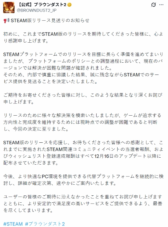 关于暂缓STEAM版发布的通告