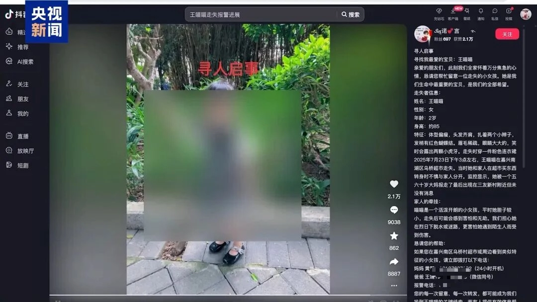 之前浙江嘉兴有个男子,为了增加粉丝量,编造了“2岁女儿被抱走”的虚假寻人信息,还盗用他人孩子的照片制作寻人启事,利用AI生成孩子的详细特征。这条虚假信息发布后短短十几个小时,播放量就突破了160万,无数网友为此揪心并纷纷转发。然而警方调查后发现,该男子根本没有结婚生子,最终他也被依法处以行政拘留。