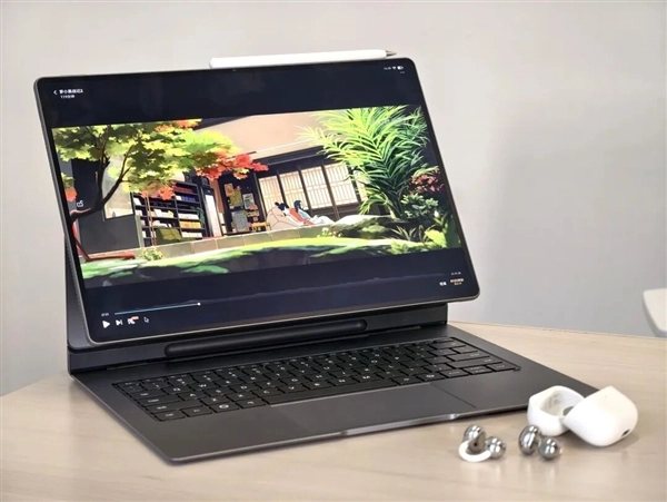然后两者一结合的时候,它就能够通过磁吸给吸住,这个时候你就获得了一个长相神似 iPad + 妙控键盘的设备。