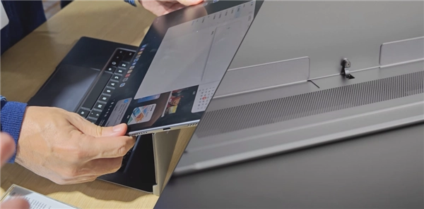 然后直到活动现场,托尼才发现它其实是一台设备,它的连接方式也非常巧妙,键盘本体有一个能展开的磁吸支架,平板又自带一个神似微软 Surface 的铰链支架。