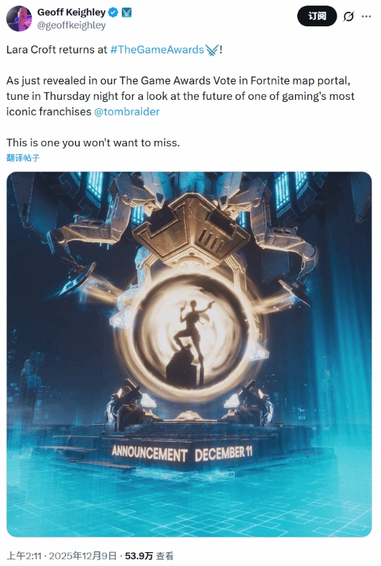 他写道,“正如刚刚在我们《堡垒之夜》的TGA投票地图门户中揭示的,请于周四晚间锁定直播,一览游戏界最具标志性的系列之一——《古墓丽影》的未来。这将是一场不容错过的盛会。”