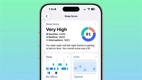 评分标准由三部分构成:综合睡眠时长占50分、就寝时间占30分、夜间中断次数占20分,总分共计100分。用户可通过iPhone健康应用程序进行查看,且该功能适配所有兼容watchOS 26.2系统的Apple Watch设备。