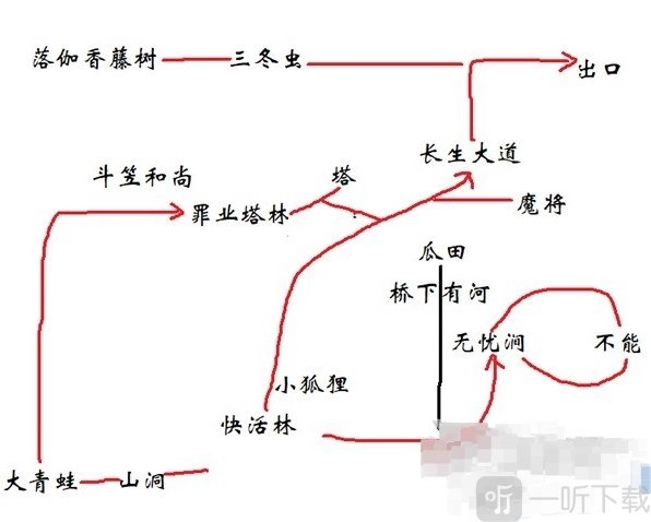 冲寒道土地庙→右边通往浮屠塔→左边通往安身寺→安身寺内遇到葫芦仙人,第二次打赤尻马猴→苦海